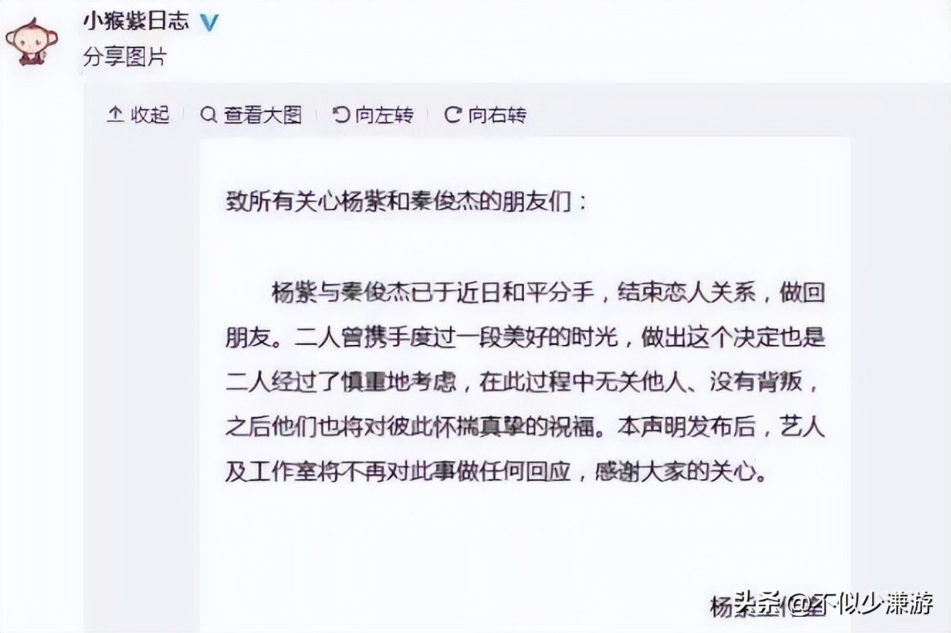 两人亲密共饮一碗汤的同一年,杨紫宣布了和秦俊杰分手。
