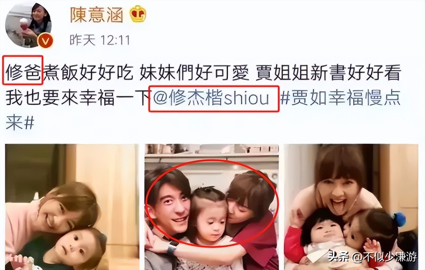 镜头里她搂着修楷杰的脖子,亲吻着贾静雯的女儿,甜蜜的仿佛一家三口一样。