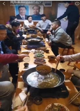 因当天下午我们驱车好几个小时,参观了贵州著名“村BA”、和“贵州村超”,回到龙塘苗寨的文远胜家,已是晚间八点了。我们参观了这栋苗寨风情的木质吊脚楼,文远胜介绍,吊脚楼的底层饲养家禽、存放杂物;我们登上二层半山腰进入家中,就见宽大的厨房和城里人少见到的大灶台、明亮的起居室和长条桌,餐室内还挂有我国领袖的两张画照,最里面是几间卧室;三层有客房和阳台。文远胜是与父母和长兄一大家子同住一起。仅从起居室和两张四五米的长桌宴摆设来看,居家很是宽敞。文家自己有两个孩子,老大是个女孩,在雷山县城里读书。他们还在县城里购买了近百平米的房子,妻子平时在县城里陪读,照顾孩子一日三餐辅导孩子学习,她每周一一早驾车20分钟,送孩子去城里读书,每周五下午带孩子一道返回龙塘苗寨。家里的老二是个男孩,因为尚未到上学年龄,则留守村里。