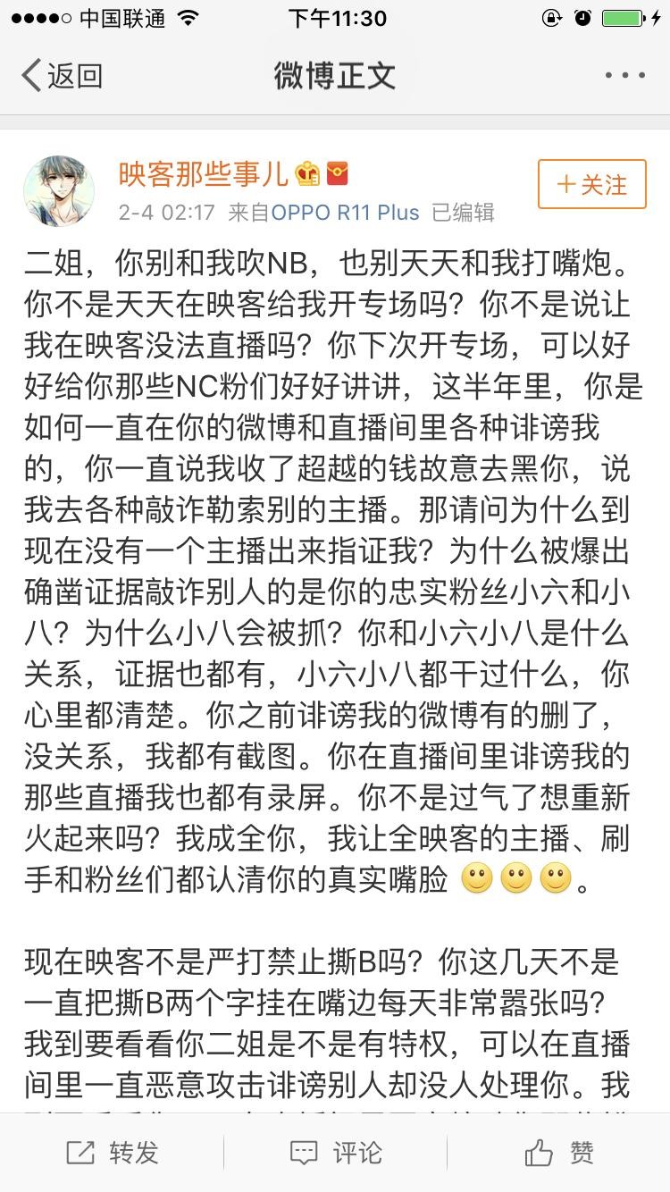 针对二姐的这番言论,“映客那些事儿”也发表了一篇长长的微博隔空回应。称二姐在直播中开专场诽谤自己,“你一直说我收了超越的钱故意去黑你,说我去各种敲诈勒索别的主播。那请问为什么到现在没有一个主播出来指证我?”