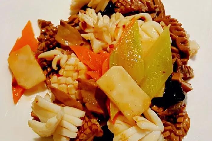 油爆双脆是湖州特色名菜之一,主要食材为当地鲜嫩的莲藕和脆皮豆腐。制作过程中,将莲藕切片,豆腐切块,分别油炸至金黄色,再加入姜末、蒜末、红椒等调料,爆炒而成。油爆双脆的独特之处在于食材的搭配,莲藕口感爽脆,豆腐外皮酥脆,二者搭配在一起,味道互补,口感丰富。此菜色泽诱人,味道鲜美,营养丰富。