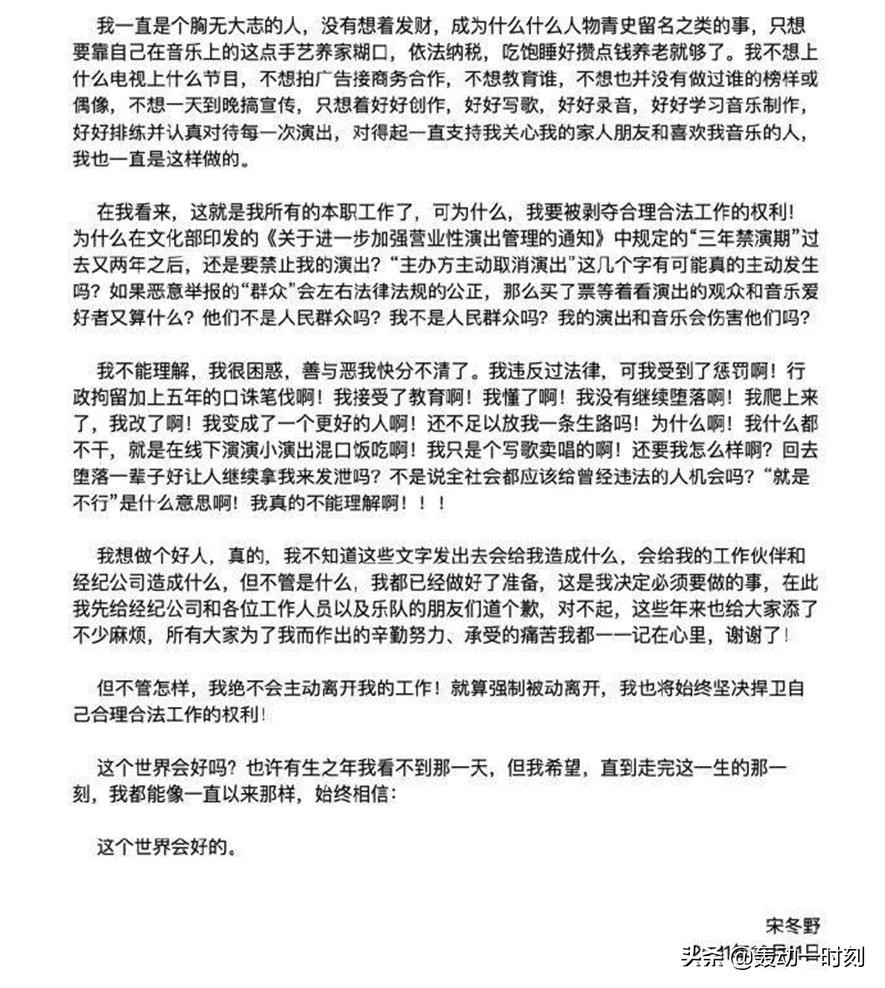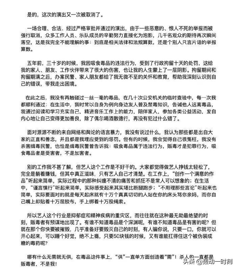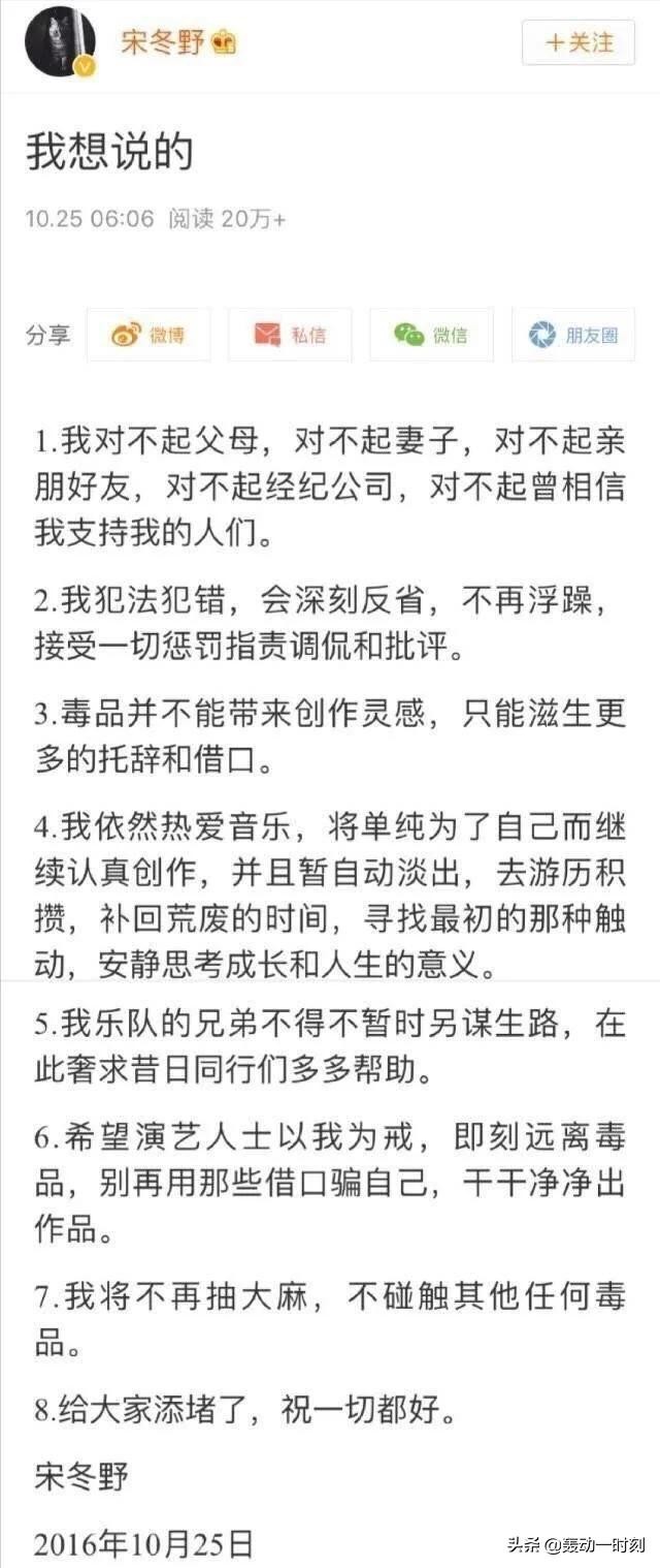 被释放出狱之后,宋冬野多次狡辩他吸毒的原因。就在前天,宋冬野的演出被取消后,发了一篇长文又继续开始了他一贯的狡辩,先说自己是为了创造“找灵感”吸了毒;后面又说是在精神焦虑之下,误信了毒品贩子......