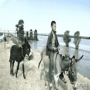 1937年8月16日,在北平战场,日军正在使用毛驴驮运物质,一个日军正在将抢来的粮食装在毛驴背上。