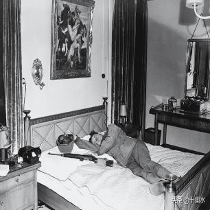 这是1945年,美国第三军占领德国后,一名美国士兵睡在赫尔曼·戈林的床上,享受胜利享受安详。