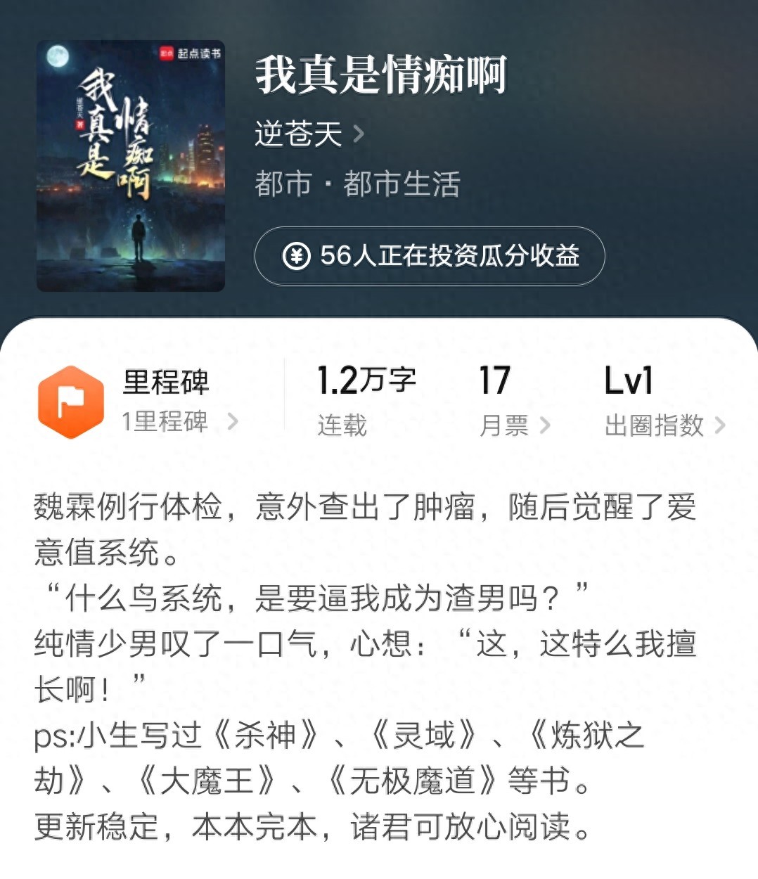 玄幻大神逆苍天转型都市,新书《我真不是情痴啊》已在起点上线