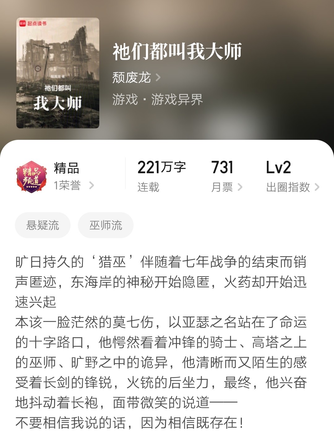 颓废龙的《祂们都叫我大师》在今天凌晨完结了,小说写了一年一个多月,均订也有接近四千的样子。上本《半邪》失利,二十万字出头切书,这本虽然成绩不算突出,但扭转了他的颓势。