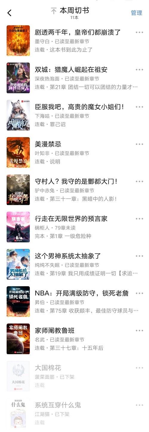 这本小说去年十一月上线的,连载有一年了,小说之前成绩不差,早早万订,就是今年五月份作者更新突然摆烂,七月恢复了一段时间又断了,等到八月更新了一章之后,再更新就是最近了。