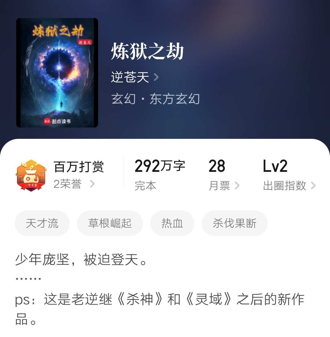 去年三月回归起点,开书传统玄幻文《炼狱之劫》,只是确实和当下起点流行风向不太符合,小说完结前也始终卡在精品前。