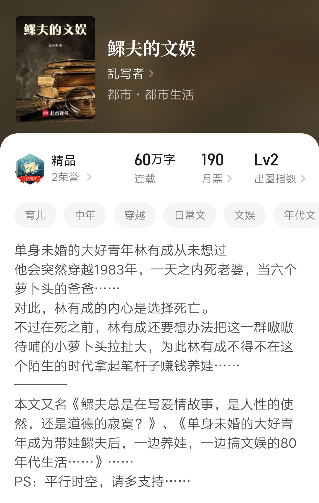 乱写者的《鳏夫的文娱》断更三个多月后已经恢复更新一周了。最近看作者更新趋于稳定,这里说一下。