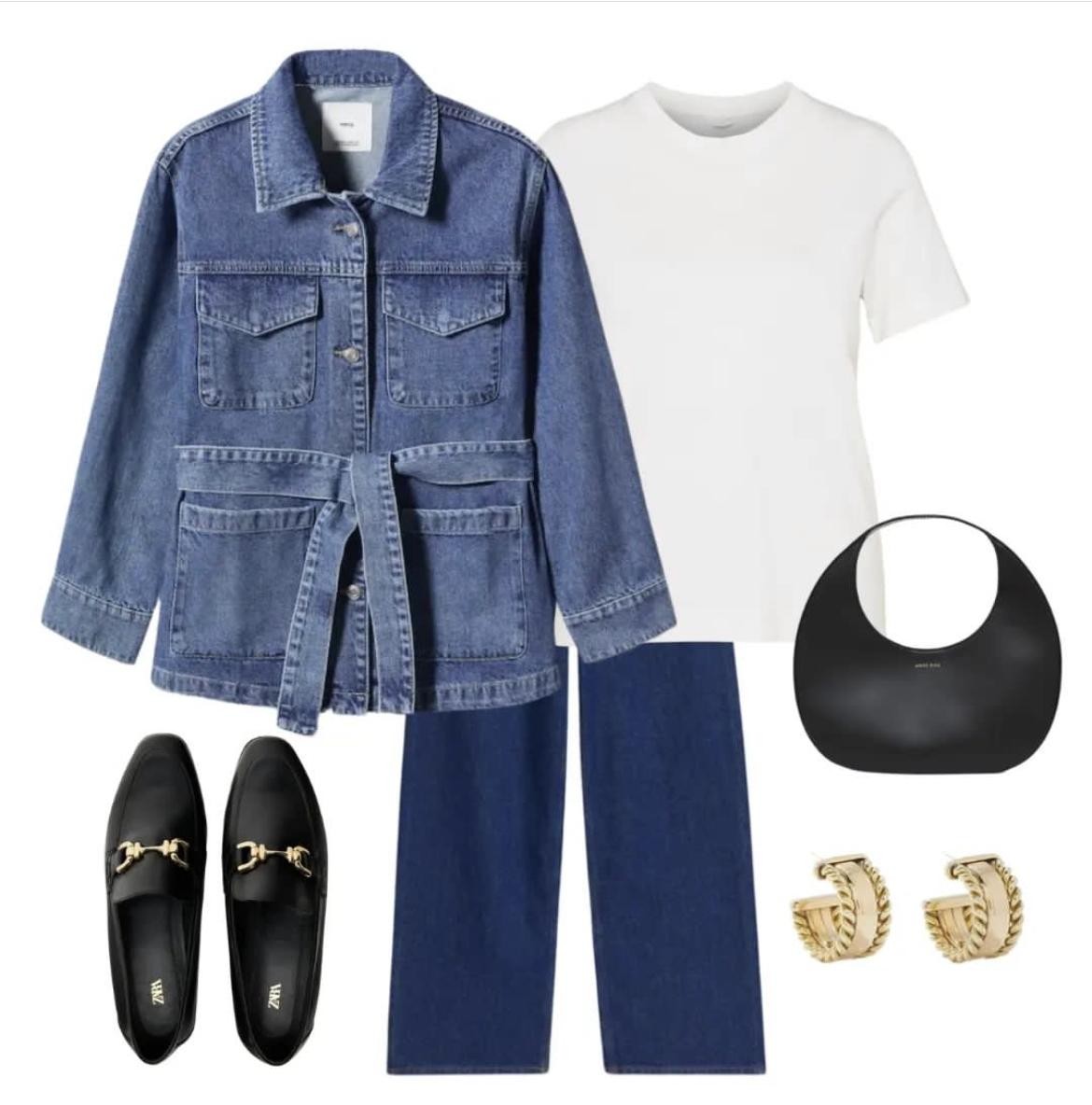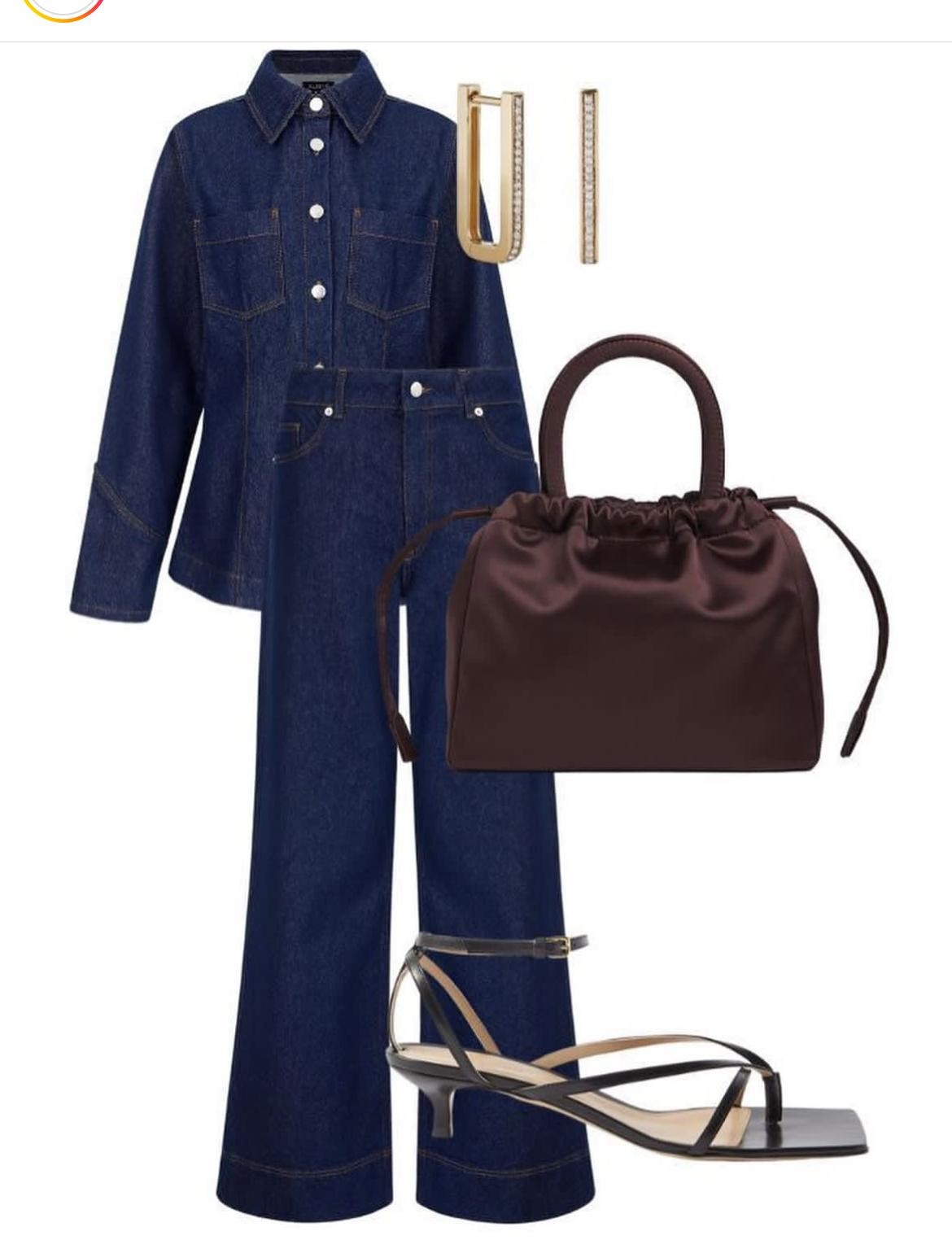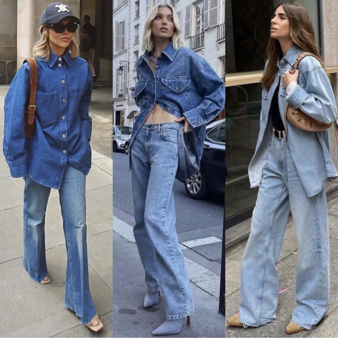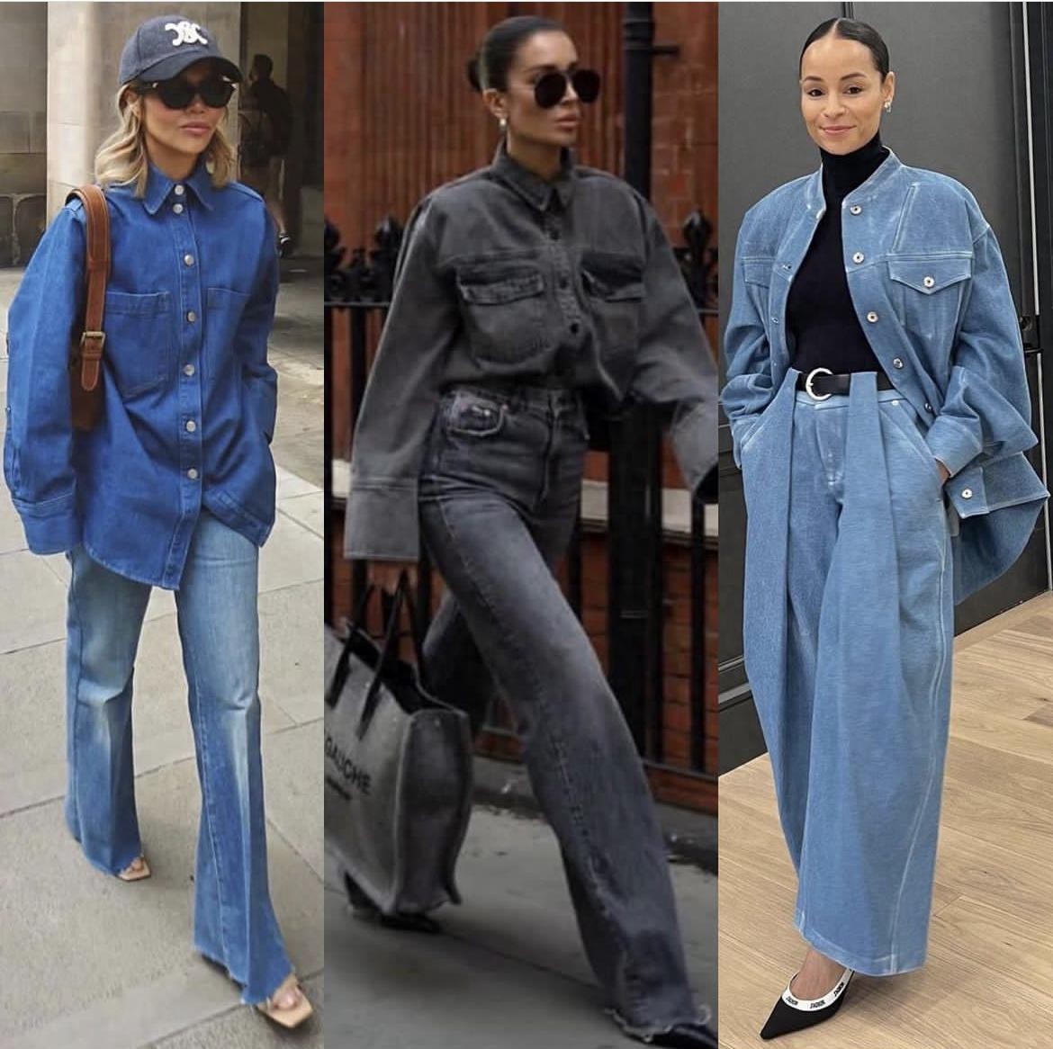 牛仔的全身穿搭思路,还可以借鉴下西装套装的思路,笔挺修身的牛仔衬衫,搭配高腰阔腿裤,有种90年代的流行风格,又因为修身剪裁显得很有型。加上合身的剪裁,这身牛仔套装可以真的穿得很有型,还显瘦显高。