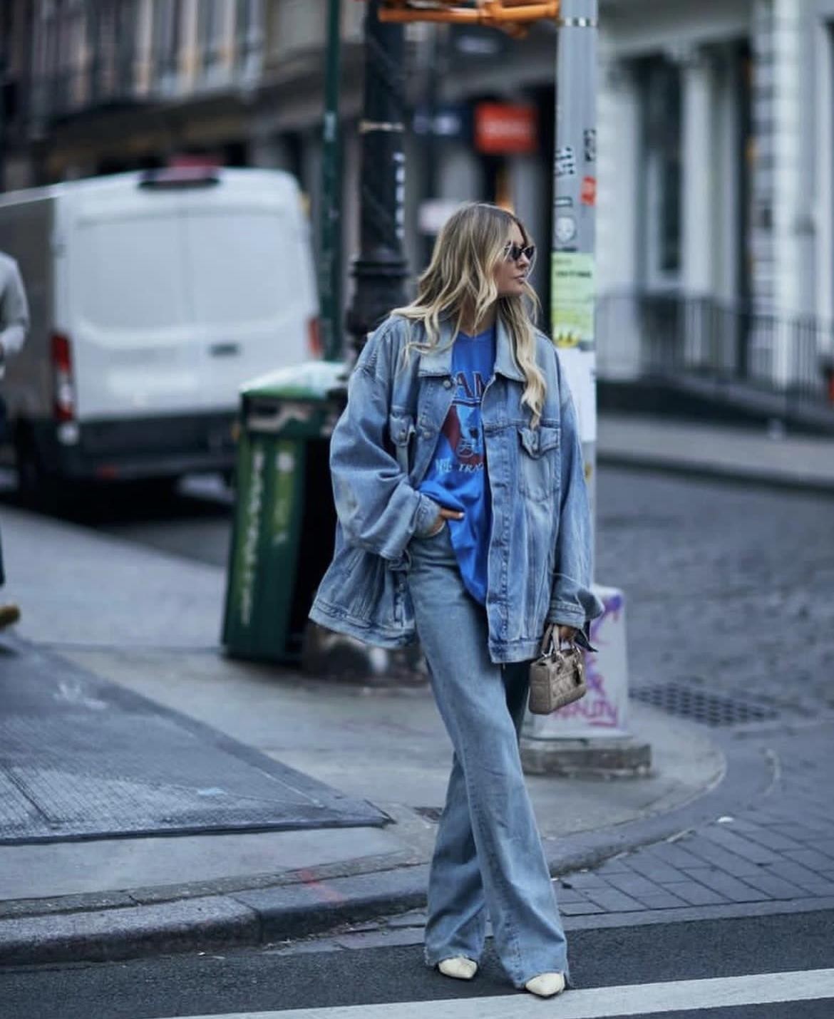想把基础款的牛仔穿得更有个性,可以选中长款的廓形牛仔夹克,配喇叭裤,再搭配一双尖头高跟鞋,穿出酷感十足的自信风范。