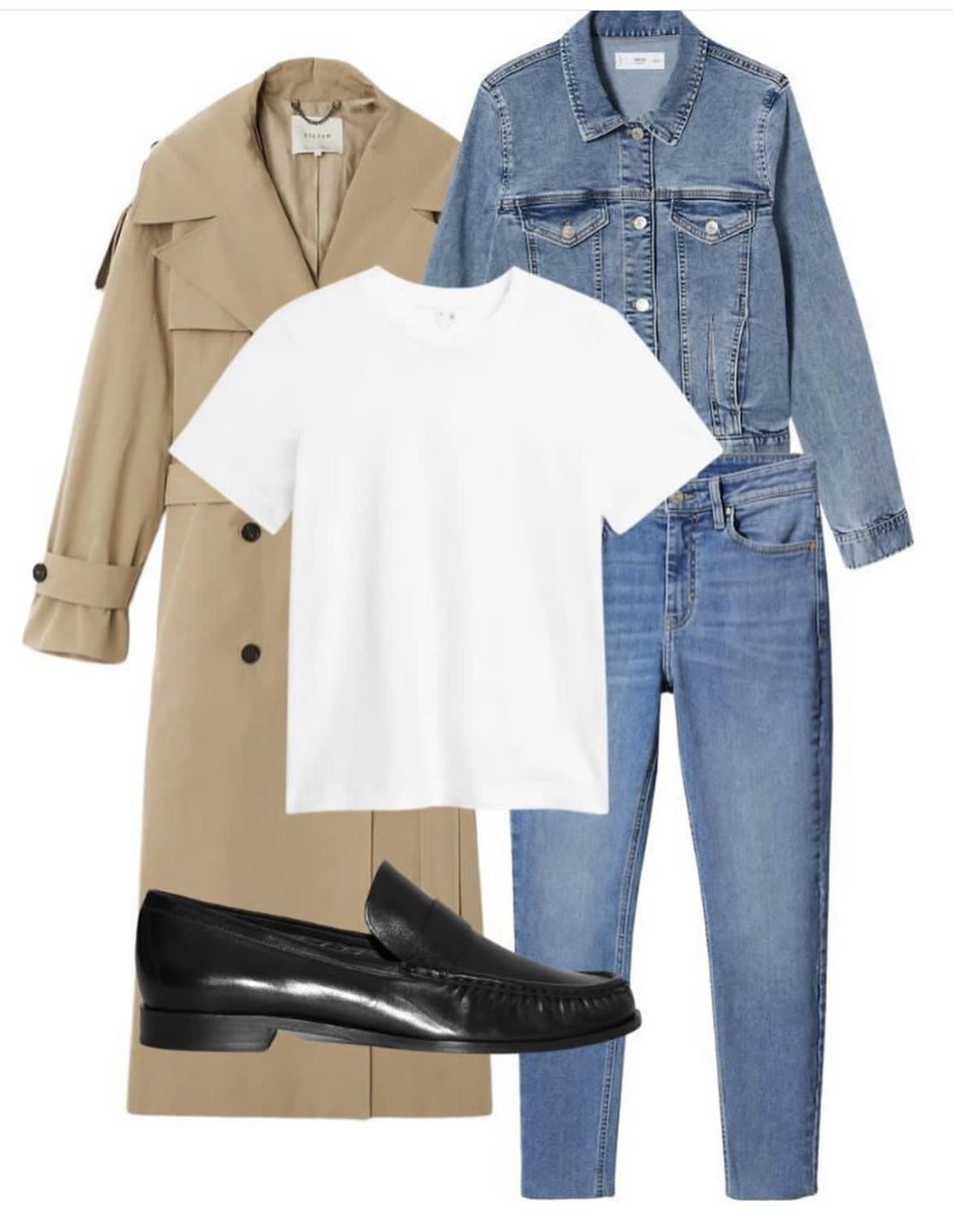 当然,我们也可以用基础款的牛仔穿出实用系的搭配。经典的牛仔夹克加直筒裤,是自然的浅牛仔蓝,再搭配一件风衣,穿出利落清爽的牛仔风格,也不会轻易过时。