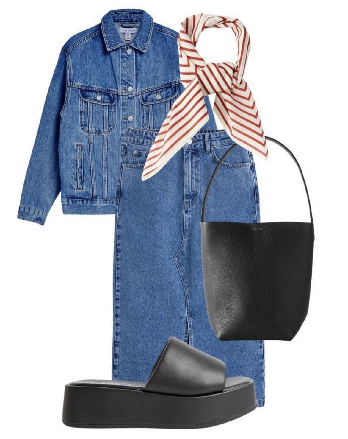 想让牛仔穿出又酷又带些优雅感,可以选短款的廓形夹克,换成牛仔半裙,立刻就有了春意十足的味道,也会穿出显年轻的感觉,点缀一条红白条纹的丝巾,春意盎然。