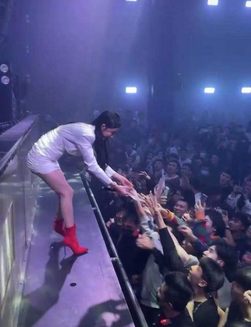 场下一众粉丝也拿起手机拍个不停,为了让气氛燥起来,潘南奎还弯腰和粉丝亲密互动,这让原本就短到大腿根的裙子雪上加霜,险些走光。