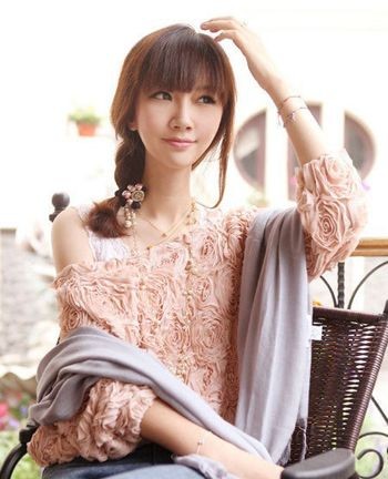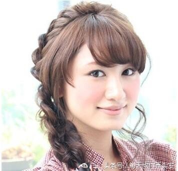 长脸女生梳理着齐刘海皮筋直发,所有的直发聚集在一侧耳后编织成麻花辫,发尾用带着流苏的皮筋扎住,垂在身前,齐刘海继续散落在额前,非常淑女的侧麻花辫尽显女生优雅雍容的气质。