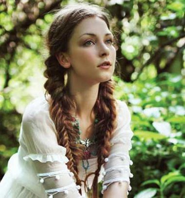 将中分梳理的微卷长发脑后均分后,在耳朵的后方编成浪漫凌乱的长鱼骨辫,对称的编发垂在身前,衬托着甜美的小脸,置身森林中,宛若空灵不食人间烟火的精灵,是那么的圣洁美好。