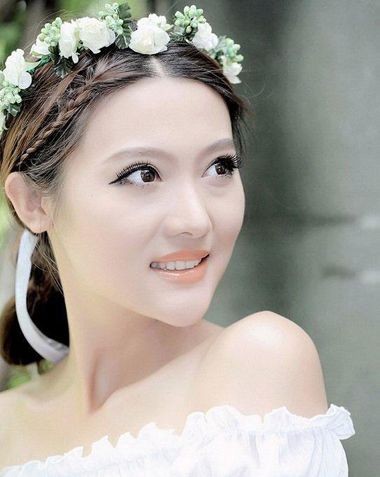 中分梳理的中长直发,将中分长刘海编织成细细的三股辫,直至发尾,然后与中长直发一起向后梳理,在脑后发际线处盘成可爱简约的丸子头,戴上一款用鲜花编织的花环,女生的甜美与纯真完全的展现出来。