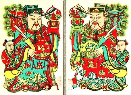 门神又分文门神和武门神,文门神一般文官打扮,手持如意、官帽、金银财宝等,寓意升官发财,加官进爵。武门神一般武官打扮,穿有盔甲,手持兵器,寓意驱邪避鬼,卫家宅保平安,降吉祥。
