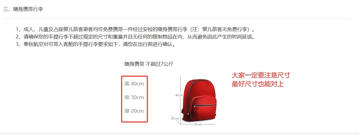 除了上述常见的20寸登机箱标准外,还有一些小型航空公司(通常是民营航空)的廉价航班,在登机行李规定上有所不同,一定要注意是廉价航班,如下图,如果不是廉价航班,其实和上边的大航空公司和地方航空公司规定也一样。这些航空公司可能根据机票类型、舱位等级等因素,对登机行李的尺寸和重量进行更细致的划分。