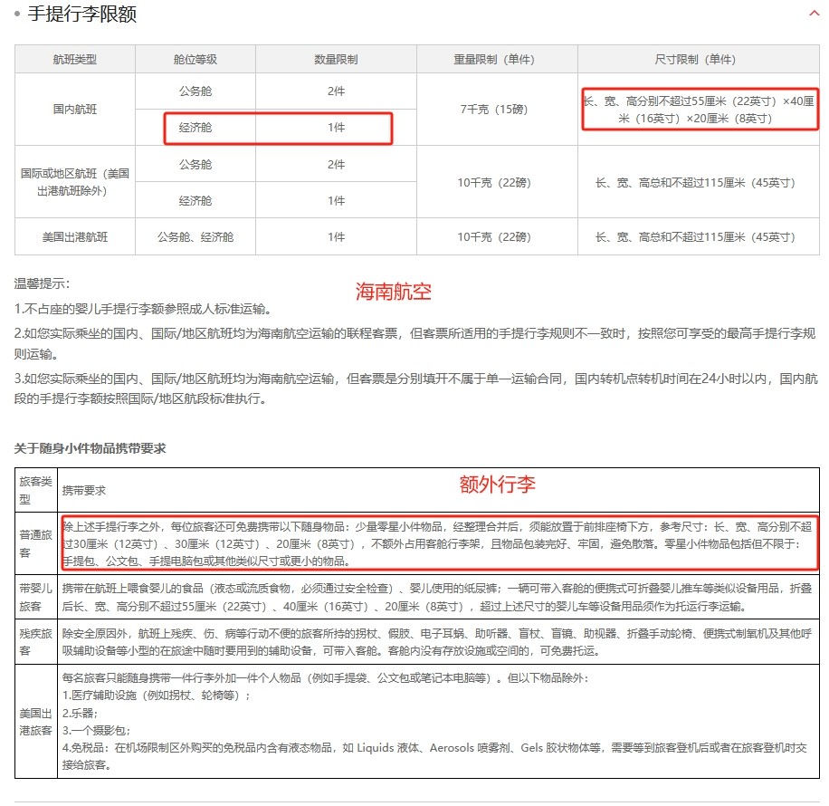 尽管海南航空给出了具体的尺寸参数,但在实际执行中,各航空公司的标准还是有所差异的,不一定按照海南航空这样的尺寸执行。有时,乘客带着稍微大一些的双肩包也能顺利登机;但有时,一旦超过规定尺寸,就必须去托运。这主要取决于航空公司的严格程度和当时机舱的行李架空间情况。所以具体能否携带一箱一包,此处只能给大家说大概率可以带进去,但是那个额外带的包,大家千万别太贪心,不要太大了。