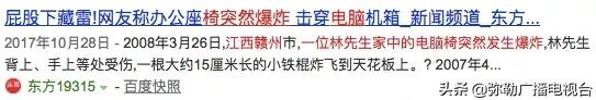 2008年3月,江西赣州一位林先生家中的电脑椅突然发生爆炸,林先生背上、手上等处受伤,一根大约15厘米长的小铁棍炸飞到天花板上。