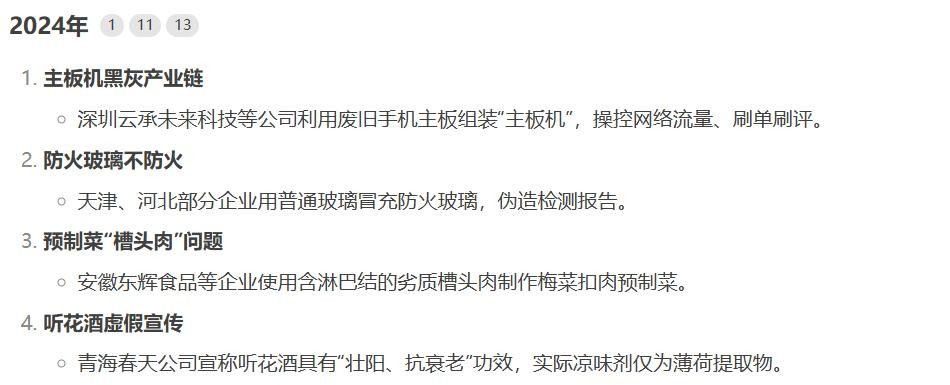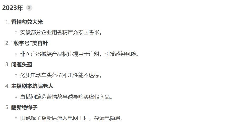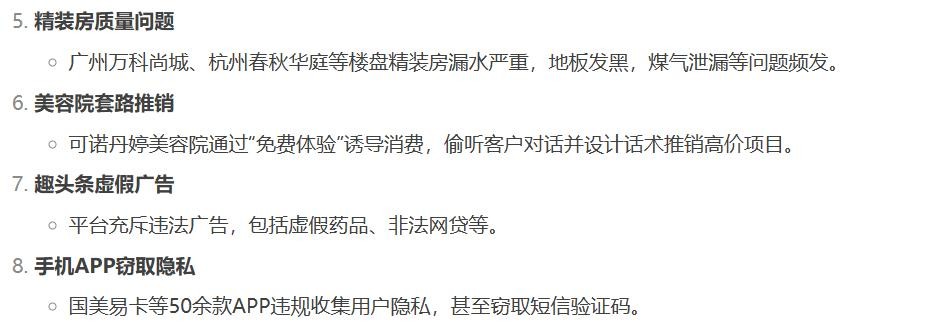 企业处罚:多数被曝光企业面临罚款、吊销许可证或注销,如深圳云承未来科技已注销,安徽东辉食品被罚超500万元113。行业整改:如预制菜行业加强肉类产品专项整治,防火玻璃市场开展质量排查。消费者行动:部分案例推动集体诉讼或退款,如三只羊直播间因“槽头肉”事件主动退款。