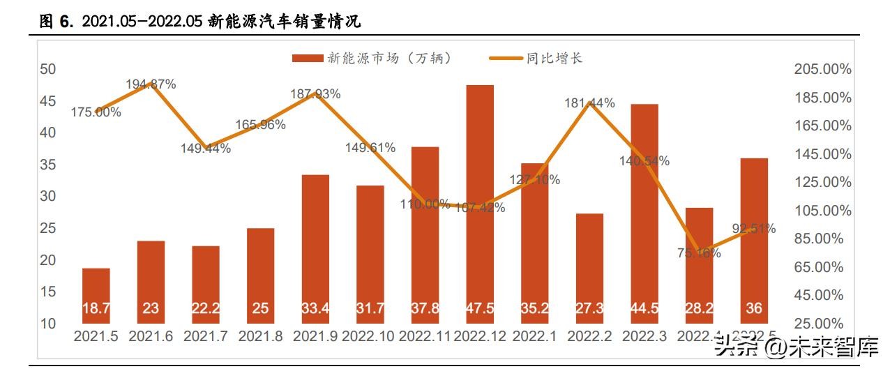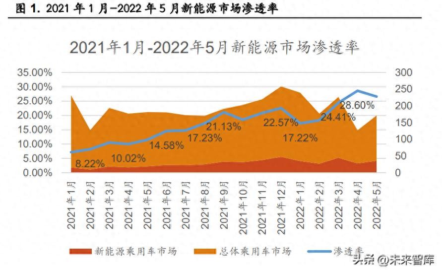 新能源乘用车渗透率取决于需求端、供应端、政策端的共同作用。据乘 联会数据显示 2022 年 1-5 月新能源汽车渗透率已达到 23.4%,已提前实现国 务院办公厅在《新能源汽车产业发展规划(2021—2035 年)》中提出的,到 2025 年新能源汽车新车销售量达到汽车新车销售总量的 20%左右目标。 整体来看,无论是从消费者的购买意愿、车企电动化目标和新型车型推 出能力、政策对于新能源市场的支持,目前新能源市场都保持着较高的增长 活力。2021 年全年新能源汽车渗透率达到了 13.4%,2022 年前 5 个月渗透率 已经突破了 20%,6 月新能源车零售渗透率更是已达到 27.4%。若按照目前高 增长态势,新能源汽车 2022 年渗透率或将达到 30%,2025 年或将达到 40%。 但由于上游原材料涨价压力、芯片短缺、政策补贴的结束、乘用车需求 的降低、技术更新迭代带来本土车企品牌的淘汰等因素新能源汽车渗透率仍 有变数。