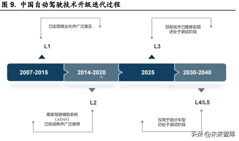 中国自动驾驶技术仍在不断迭代升级中,2007-2015 年 L1 级别已实现商 业化并广泛普及;2014-2020 年 L2 级别的高级驾驶辅助系统(ADAS)已经 成熟并广泛使用,代表车型包括特斯拉 Model3、上汽大通 D90 等;2025 年 将计划实现 L3 级别自动驾驶,目前技术已能够实现,还处于测试阶段,代表 车型包括奥迪 A8、广汽新能源-埃安 Lx 等;2030-2040 年计划实现 L4/L5 级 别自动驾驶,仅用于部分车型,仍处于测试阶段,代表车型包括一汽-Apollo红旗电动车、比亚迪-xUrban-秦 Pro 等。