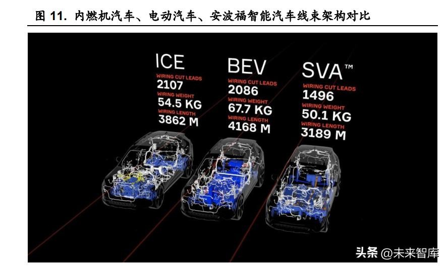 安波福设计的 SVA(SmartVehicleArchitecture)架构方法通过向上集成, 建立扁平的电源主干,优化低压布线,并通过 Dock&Lock 连接器实现更加自 动化的组装。SVA 方法不仅消除了将 ICE 架构转换为 BEV 架构时增加的额 外布线重量,还额外节省了 8%的布线重量、600 根切割引线和 900 多米长的 布线。 特斯拉通过新 EEA 架构,将汽车线束由 ModelS 的 3km 减少至 Model3 的 1.9km。