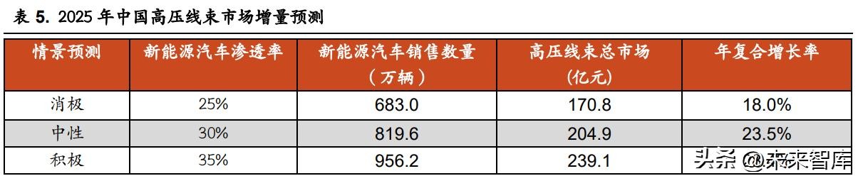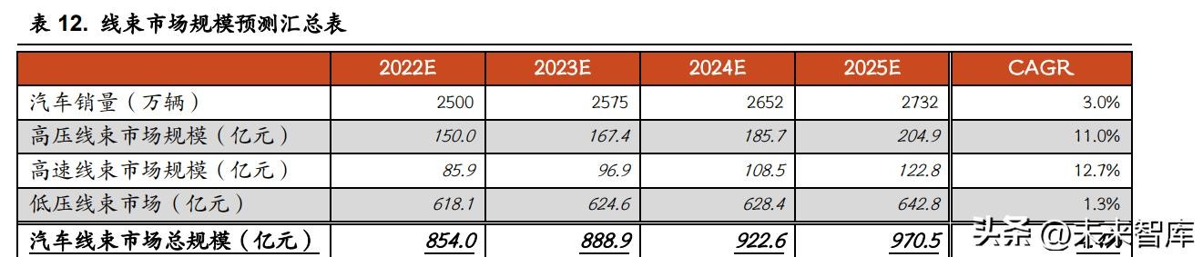 高压线束方面,随着汽车电动化程度的提高,车辆的驱动方式出现了根 本性的改变,为了保证车辆的动力输出和能源补充,高电压是必然的解决方 案之一,因此市场整体对高压线束的需求也日益增长,预计 2022-2025 年高 压线束市场规模将分别达到 150.0、167.4、185.7、204.9 亿元。 类似的思路,高速线束市场受益于车辆智能化程度的提升,包括但不限 于自动驾驶相关系统的智能化系统对于数据采集和传输的要求大大提高,因 此高速线束的需求量预计将出现明显增长,这部分市场也将是线束行业内的增量市场,预计 2022-2025 年市场规模将分别达到 85.9、96.9、108.5、122.8 亿元。 在传统低压线束方面,但车辆电气架构从分布式架构到集中式架构再到 中央架构,线束连接方式将迎来新的变革,单车线束的需求会逐渐减少,尽 管由于我国汽车销量仍能有一定增长,但线束市场的增速会更低,总体来看 基本保持不变,我们预计 2022-2025 年低压线束市场规模分别为 618.1、624.6、 628.4、642.8 亿元。