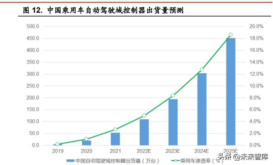 目前域控制器渗透率较低,但域控制器行业保持高景气状态。目前座舱 域控制器座舱域控制器已经较大规模应用,未来渗透率提升最为迅速,出货 量未来将大幅提升。自动驾驶域控制器随后续车企 L3 级以上功能的推出,在 2022 年开启加速渗透时代。车身、底盘域、动力域控制器处于前期阶段,后 续渗透率有望持续提升。 根据亿欧智库《2021 中国汽车座舱智能化发展市场需求研究报告》,智能 座舱的渗透率在 2021 年已达到 50.6%,其中渗透率最高的车型价位区间为 20-25 万元,高达 58.4%,所有含智能座舱的车辆中,中控彩屏的渗透率高达 97.9%。与此同时,在座舱智能化发展过程中,搭载 OTA(远程在线升级技 术)功能也越来越普及,OTA 当前渗透率已达 50.9%。盖世汽车研究院预测, 到 2025 年智能座舱域控制器出货量能够超过 500 万,复合增长率 50%以上。 据佐思汽研统计,2021 年中国乘用车自动驾驶域控制器年出货量已达到 53.9 万台,渗透率 2.7%,预计 2022 年渗透率将超过 5%,到 2025 年中国乘用 车自动驾驶域控制器年出货量将达到 452.3 万套,渗透率达到 18.7%,核心驱 动力为 L2+行泊一体域控制器出货量迅猛增长。