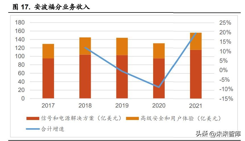 安波福现有高级安全与用户体验和信号与电源解决方案两大核心业务部 门: 高级安全与用户体验部门的主要业务包括:主动安全系统(ADAS)、信 息娱乐与用户体验、移动出行与服务、网络连接与安全等内容,核心产品为 智能驾驶传感器、智能驾驶系统及平台、智能汽车内部感知系统、汽车电子 控制单元以及域控制器。