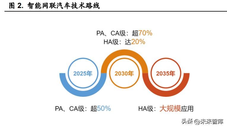 新能源汽车的发展不仅是在汽车的能源供给上进行更替,与此同时也伴 随着智能化对非智能化的逐步迭代。 中国颁布的《智能网联汽车技术路线图 2.0》进一步明确发展线路:到 2025 年,PA(部分自动驾驶)、CA(有条件自动驾驶)级智能网联汽车市场份额 超过 50%,HA(高度自动驾驶)级智能网联汽车实现限定区域和特定场景商 业化应用;到 2030 年,PA、CA 级智能网联汽车市场份额超过 70%,HA 级 智能网联汽车市场份额达到 20%,并在高速公路广泛应用、在部分城市道路 规模化应用;到 2035 年,中国方案智能网联汽车技术和产业体系全面建成、 产业生态健全完善,整车智能化水平显著提升,HA 级智能网联汽车大规模 应用。
