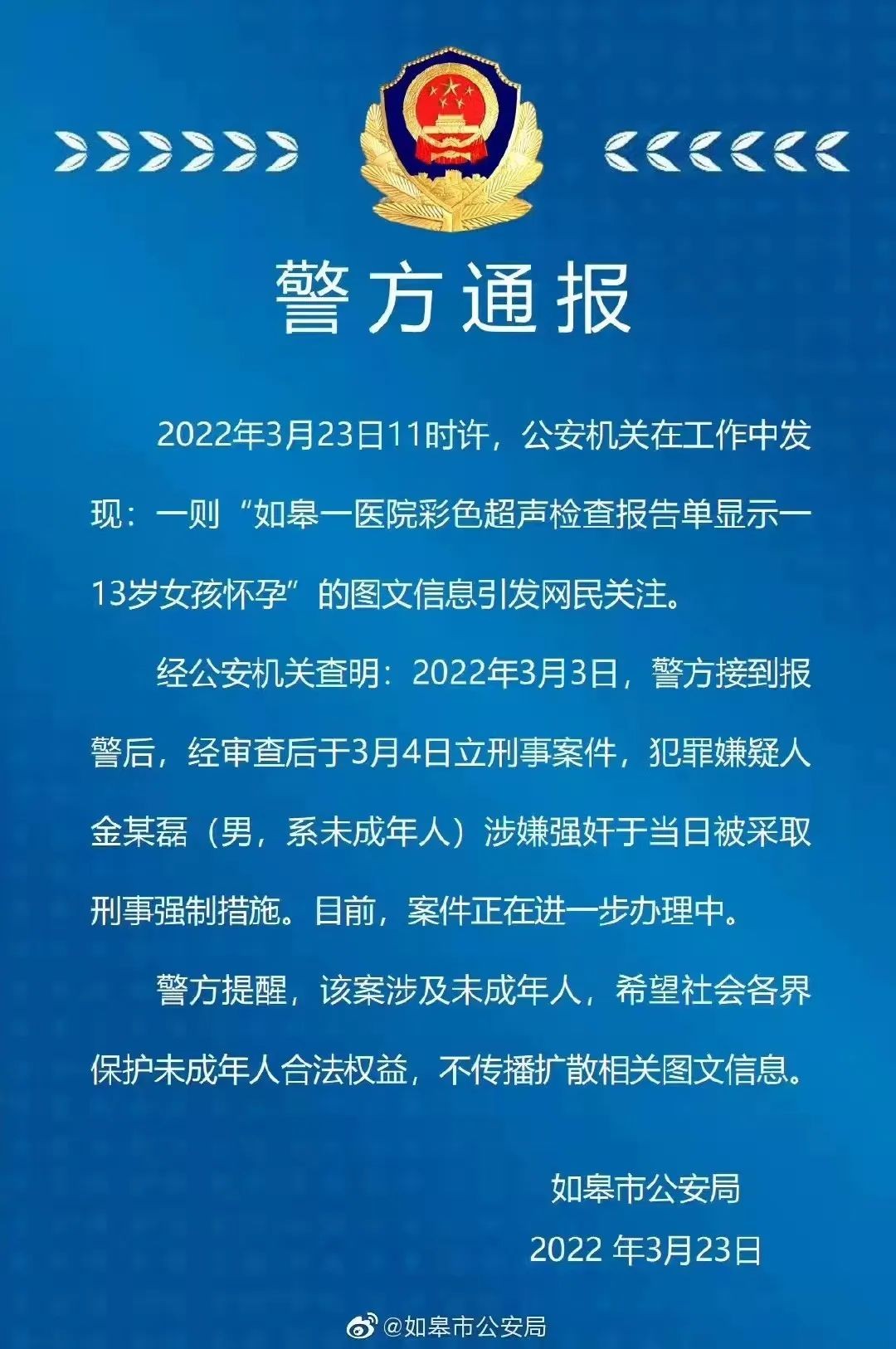 上个月,一则「江苏如皋警方通报 13 岁女孩怀孕」的新闻引发了网友的关注。如皋某医院一位医生发现女孩彩超报告显示怀孕后立刻报警,警方已于次日立案侦查,对犯罪嫌疑人采取强制措施。