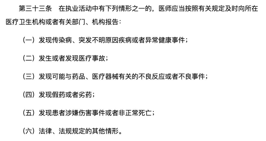 在新医师法第三章执业规则中,医师没有相关权利,只在第三十三条第五款中提及了「发现患者涉嫌伤害事件或者非正常死亡」的报告义务。医生的越俎代庖反而可能影响正常的案件办理程序。