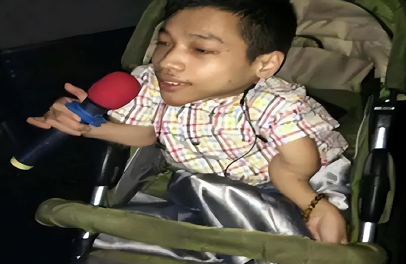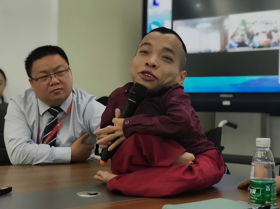 因为李创利的身体严重畸形,几乎整个蜷缩在轮椅之上,与他旁边身材匀称的央视主持人相比,显得格外瘦小且形态异常,然而他脸庞上始终洋溢着阳光般的笑容。