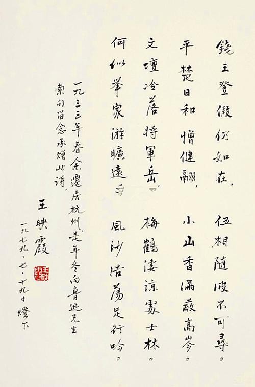 王映霞(1908-2000),浙江杭州人,本姓金,小名金锁。出身于书香门第,父亲早逝,自幼由外公王二南抚养,改名王旭,号映霞。王二南先生学识渊博,满腹经纶。王映霞从小受到良好的传统文化熏陶,先在外祖父自家的蒙馆读《三字经》,后入教会学校弘道女校。1923年,15岁的王映霞考入浙江女子师范学校。她才堪柳絮,貌比西子,已出落成一个标致的美人儿,成为校园里的一道亮丽风景。杭州女师人才辈出,王映霞更是出类拔萃,有"杭州第一美人 "之称。坊间流传“天下女子数苏杭,苏杭女子数映霞”。