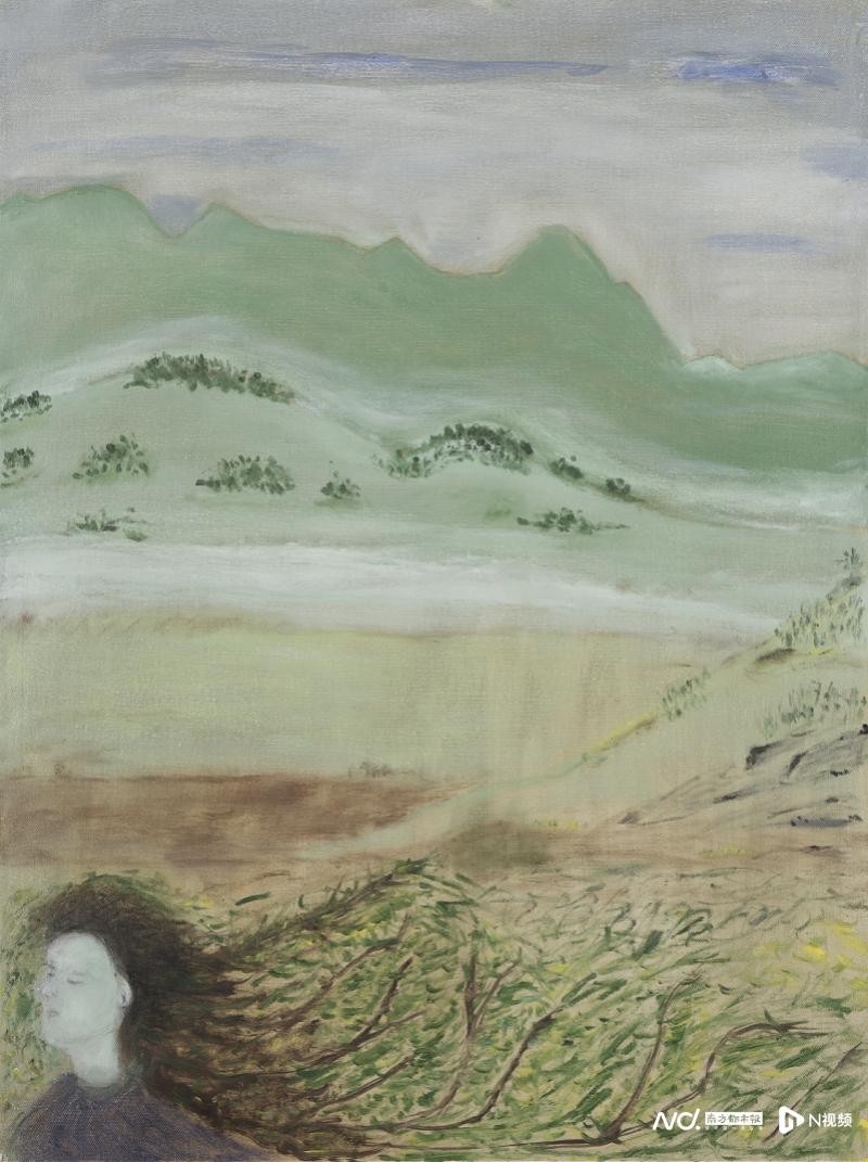南都:2021年创作的《奇异的山》《奇异的树》《向奇异走去的女人》《她游向远山》等作品,色调空灵淡雅。我尤其关注其中山水的部分。线条柔和的远山和寥寥几株树木,很有元代山水画中倪、黄的意境。你曾经写过长诗《随黄公望游富春山》,对江南山水和黄公望的绘画精神有独到的领悟。在你自己的绘画创作中,是否也受到了元代文人画的影响?