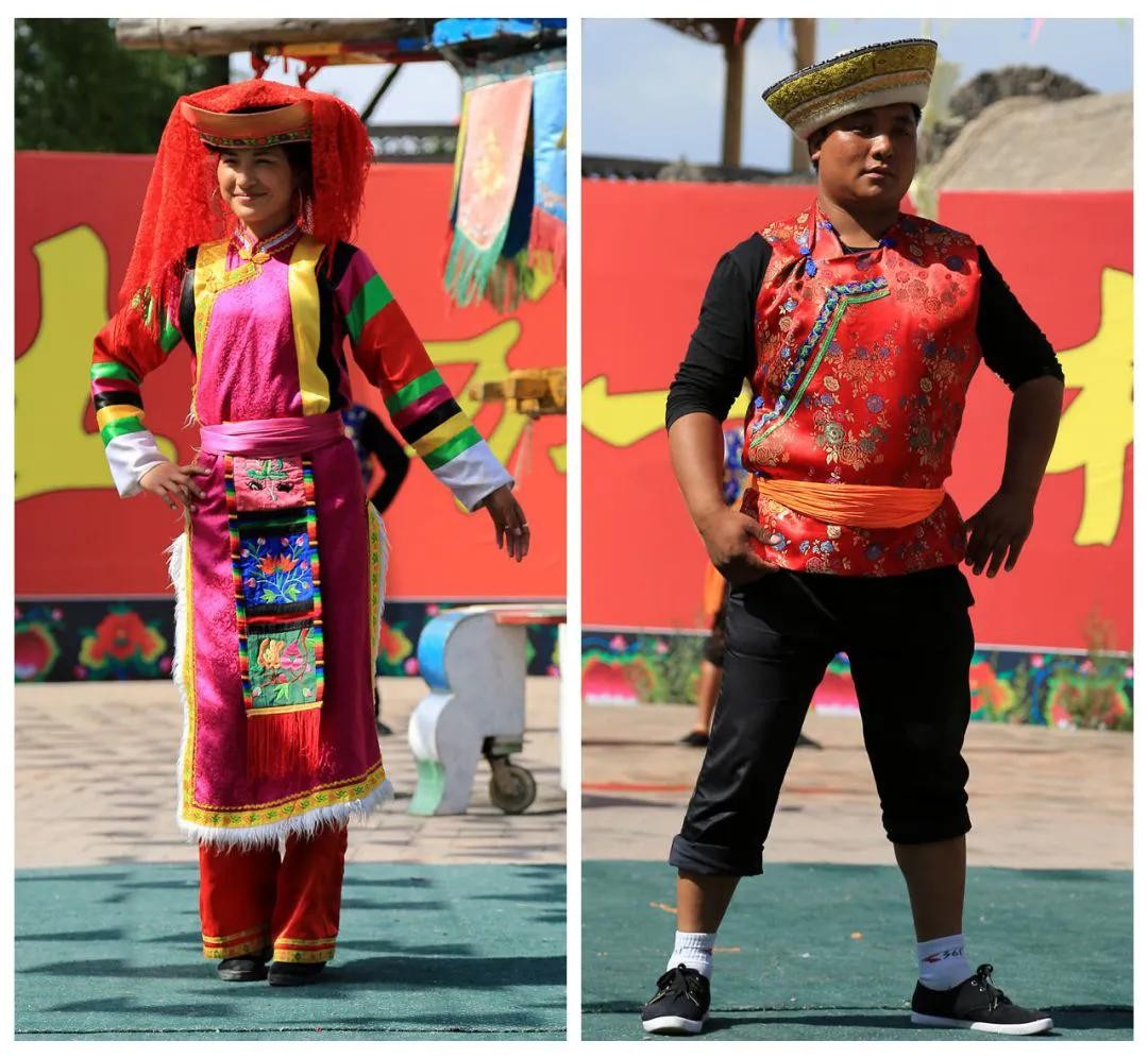 土族的服饰特点在于头饰。较有特色的当属“那仁扭达”和“托欢扭达”两类。那仁扭达插有三个箭叉造型而得名,通体大红色。托欢扭达因其外形轮廓酷似圆形的干粮饼子而得名。