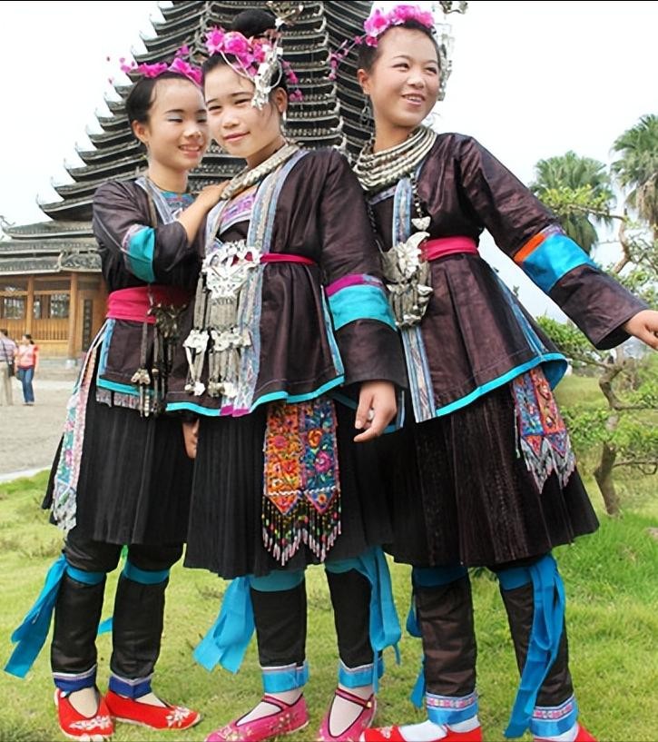 侗族由于南侗与北侗地域的差异,服饰也略有不同。侗族服饰一般都是由族民自纺的侗布制作而成。女子服饰上衣一般为无领大襟衣和大领对襟式。下装以百褶裙或长衫短裙。颜色多为黑色、青色、蓝色、紫色。