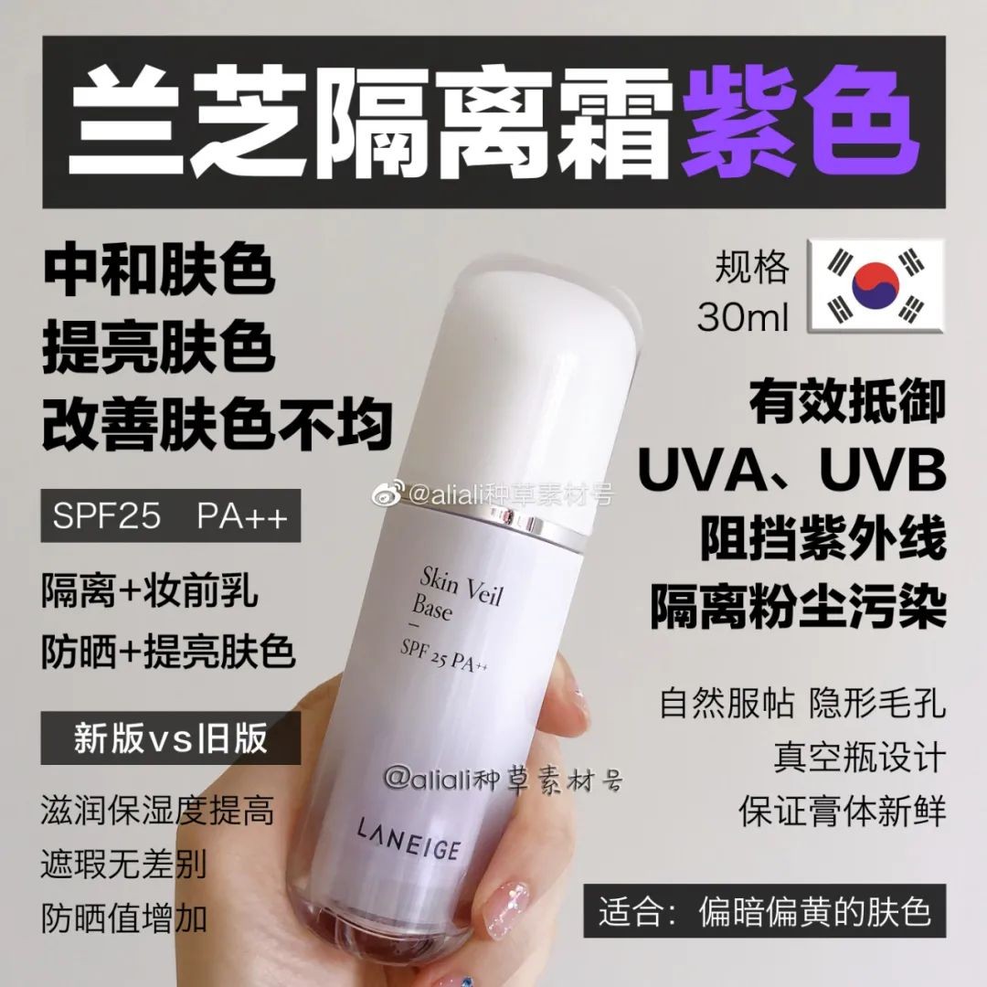 ★就肤色来说,如果你皮肤偏黄,偏暗,没有光泽,那么选紫色隔离就可以。它能迅速提亮肤色,皮肤更白,更加好看。