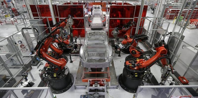 特斯拉汽车工厂全自动化流水线