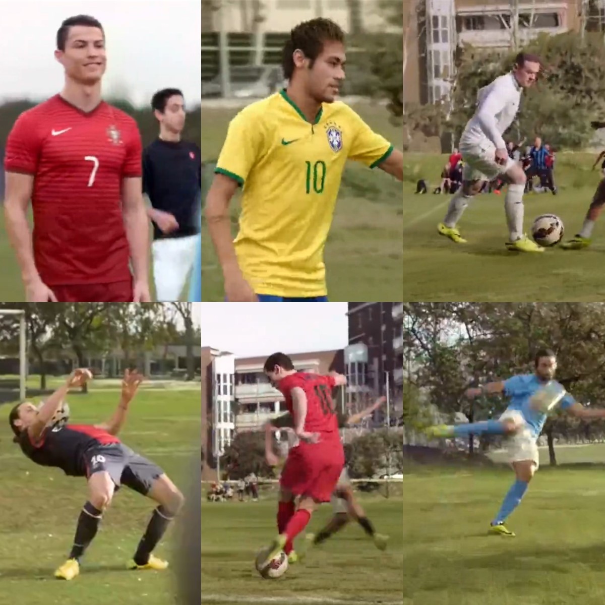 2014年,Nike发布了【RISK EVERYTING 博上一切】广告三部曲,其中第二部我最喜欢,【Winners Stay - 赢家留下】。两队青少年为了争夺球场而进行比拼。他们只要喊出球星的名字,自己就能变成那个球星。一方的队长首先变成了C罗,另一方则变身为内马尔。C罗率先脚后跟传球,接着,出现了接球、过人、射门一气呵成的鲁尼,低空胸部停球的伊布,凌空射门的伊瓜因,左右脚交叉过人的阿扎尔。