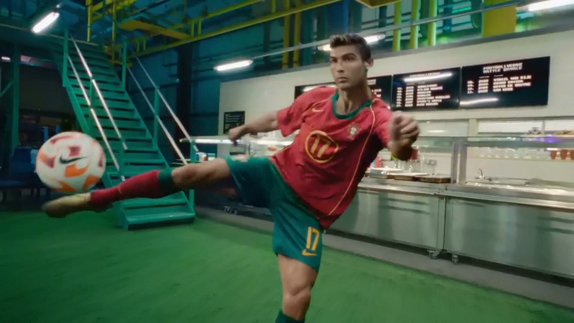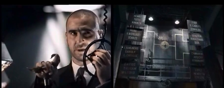 这个广告里面菲戈和卡洛斯镜头很多,菲戈进了几个脚后跟进球,卡洛斯还进了一个蝎子摆尾的进球,姿势非常奇怪。但是最后亨利、托蒂、中田英寿队和菲戈、卡洛斯、罗纳尔多队进行最终对决。比赛开始托蒂加装系鞋带,亨利踩在他身上一个头球 ,直接进球,淘汰了罗纳尔多和卡洛斯。