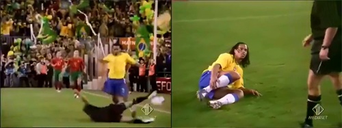 小罗登场抢到足球,在球场内一个非常漂亮的小牛摆尾过掉了葡萄牙的球员,结果被裁判一个飞铲倒地,并被红牌罚出场外。
