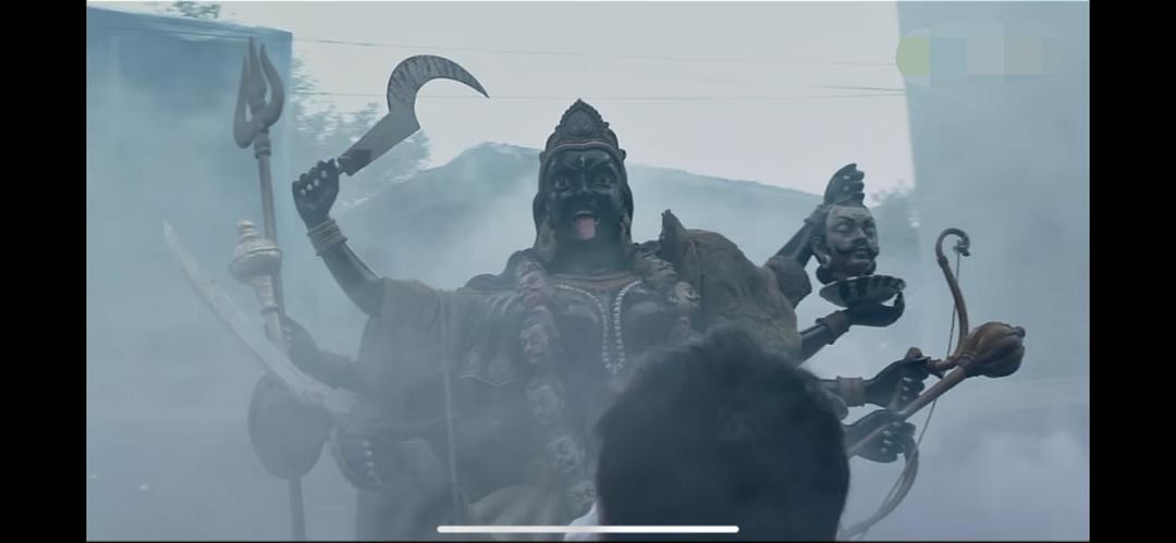 程勇的救赎始于他由“人”到“神”的形象转折点,也就是当程勇第二次踏入印度,在弥漫着烟雾的街头上,看到了迦梨神像,这一段具有极端写意色彩的镜头,通过具有宗教意蕴的意象符号实现了程勇从“小我”到“大我”的人格升华,得到了心灵的救赎,成为表现影片主题的视觉符号。