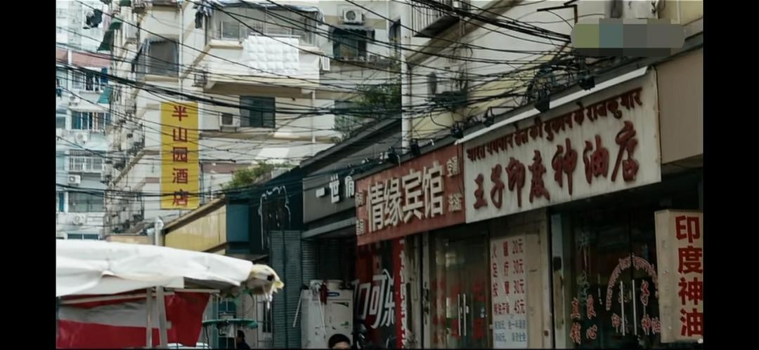 “王子神油店”的门头店名被凌乱的电线所框住,电线所组成的网亦指法网,隐喻了在法网之下所建构的社会秩序的绝对地位。