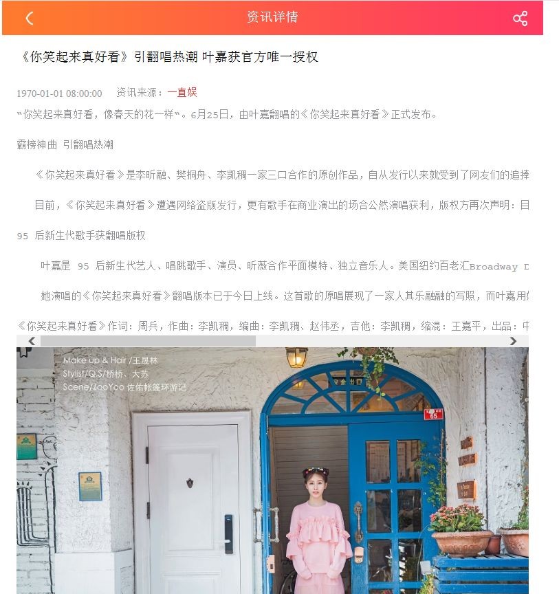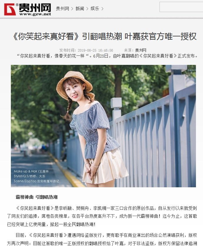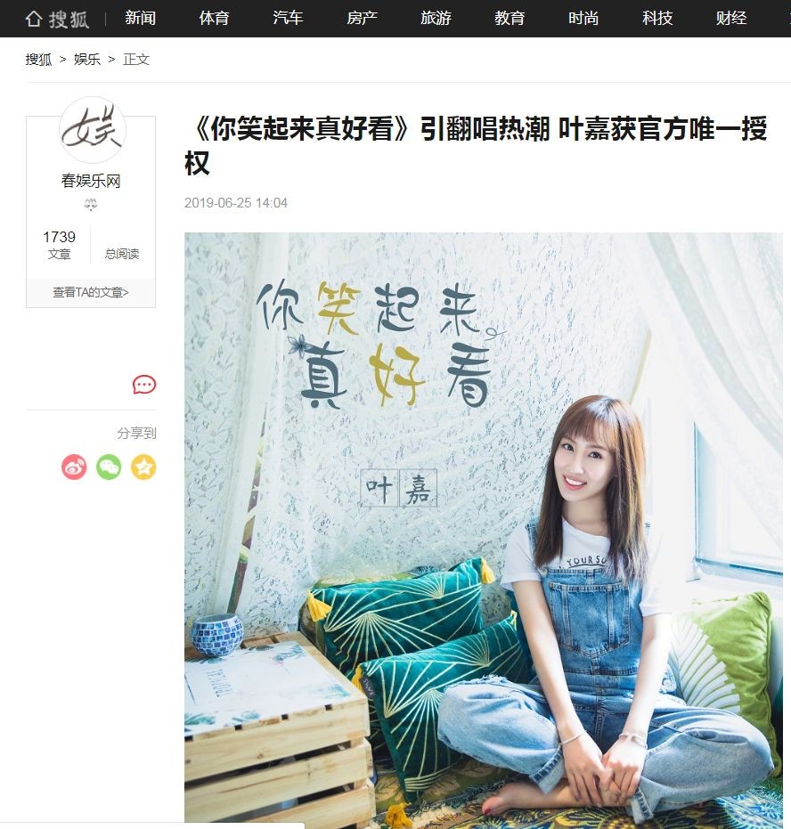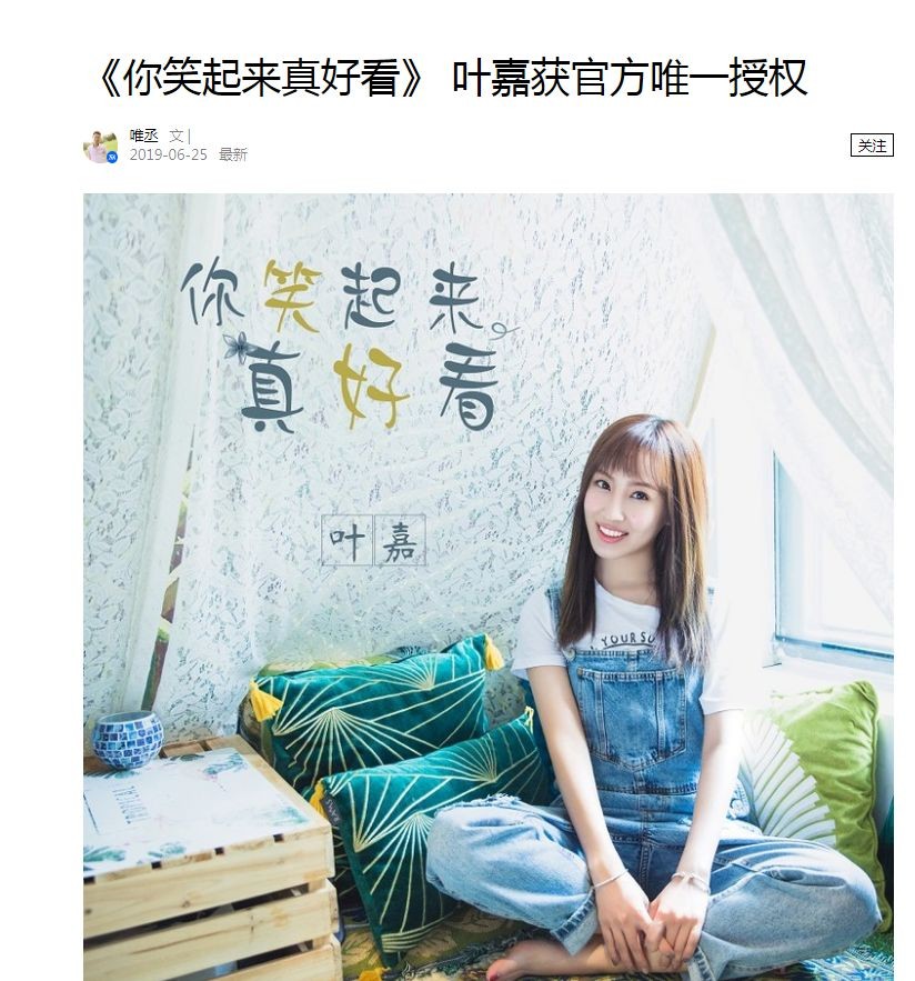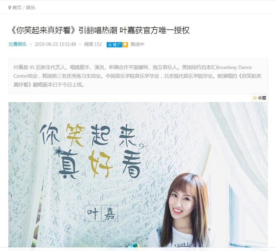 叶嘉 北京现代音乐研修学院毕业生、音乐人、歌手,2017年,发布歌曲《我的造型》担任主唱及词作者;同年9月,参与旅游卫视播出的运动女团青春拓展节目《鲜活宝贝TS919啦啦队挑战赛第二季》担任女嘉宾并表演舞蹈;2019年成为抖音最火热歌《你笑起来真好看》唯一正版授权演唱者;同年8月发行单曲《爱要大声说出来》《越热越爱》《听我说谢谢你》等歌曲。