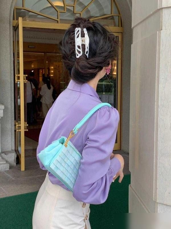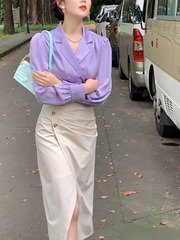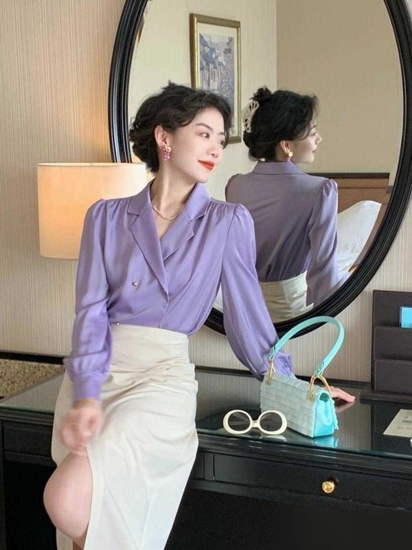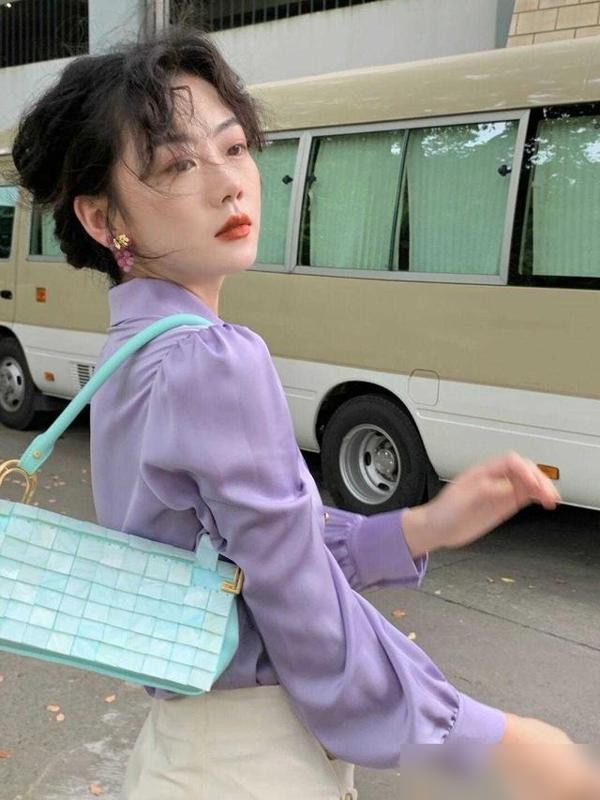 别小看了这件紫色交领衬衫,它可是散发出复古优雅气质的秘密武器哦! 选择一款颜色复古的紫色衬衫,搭配纯白色的高开叉半身裙,简直是绝配!这样的搭配不仅能凸显女性的温柔气质,还能展现出一种优雅的复古风格。