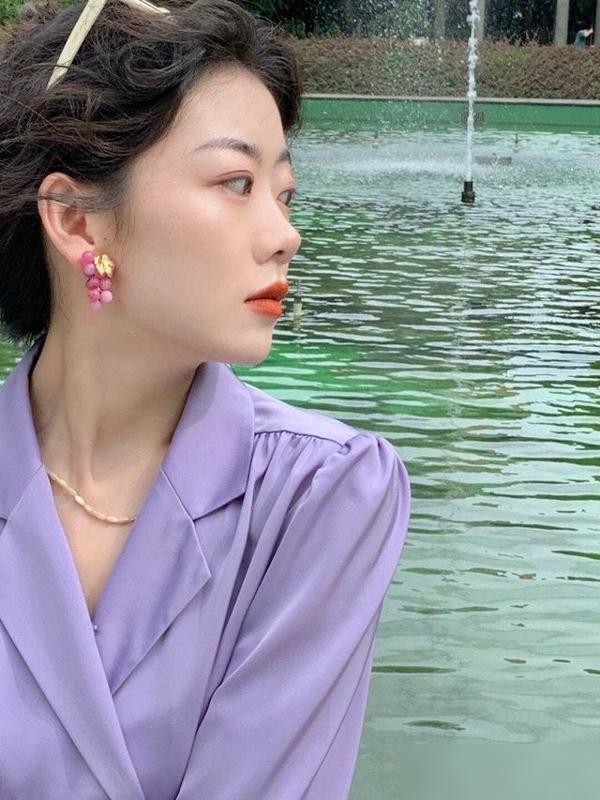 看点➊:紫色交领衬衫搭配白色高开叉半身裙,打造复古气质